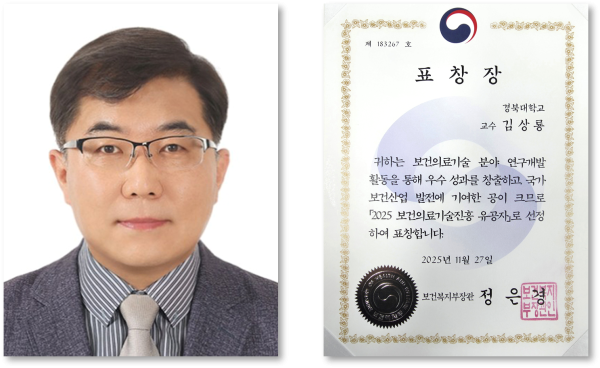 생명공학부 김상룡 교수가 ‘2025년 보건의료기술진흥 유공자 정부포상’ 우수연구 부문에서 보건복지부 장관 표창을 받았다.
